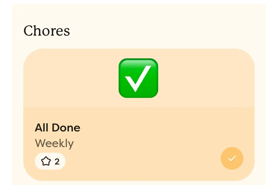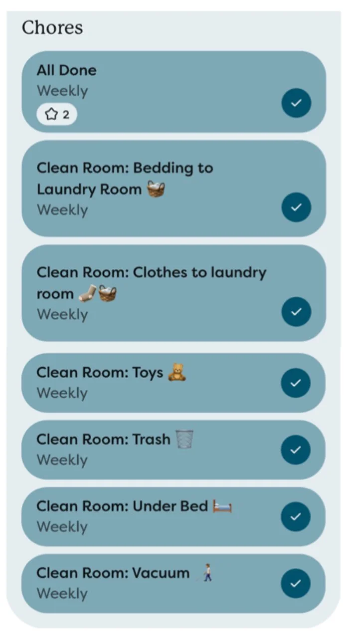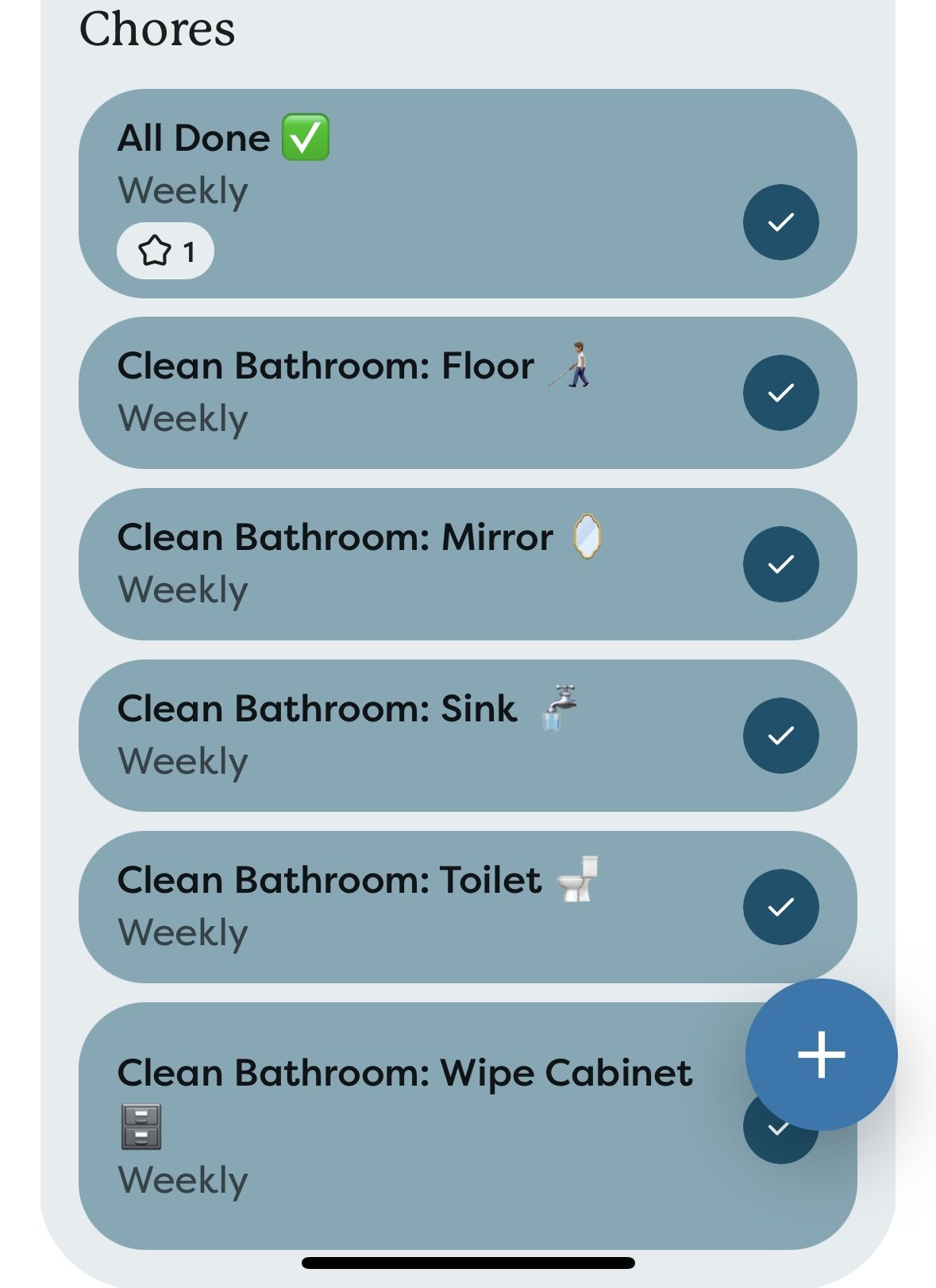 One thing I did to keep the star system simple was create a task at the bottom of each chore list called "All Done" with a green checkmark emoji. Instead of awarding a star for every individual step of cleaning a bathroom, they click "All Done" once the entire job is finished and that is what earns them stars. It keeps the focus on completing the whole job rather than rushing through each step just to rack up stars.
