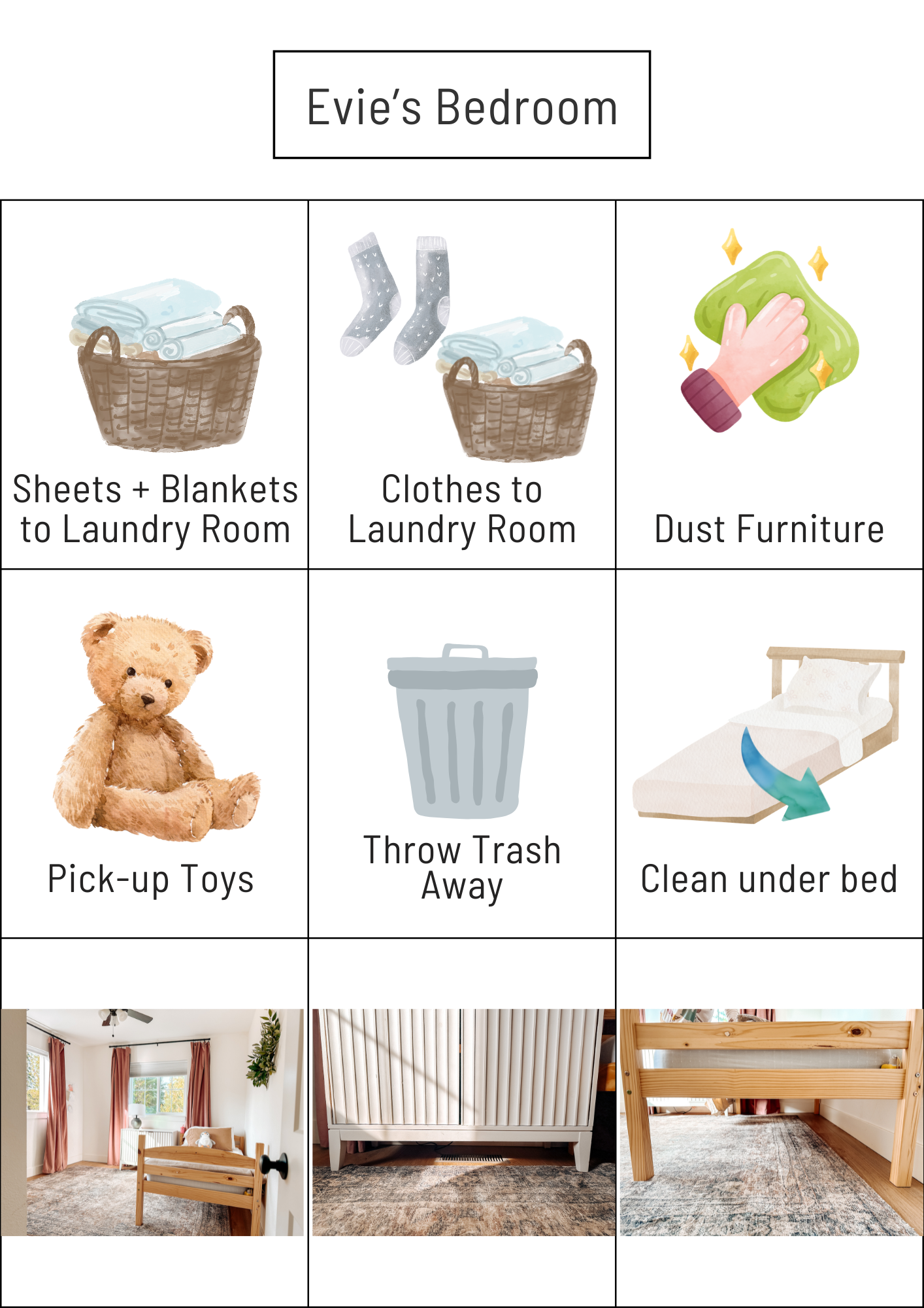 I made the same type of laminated instruction sheet for their bedrooms. It hangs on the wall and includes a picture of exactly what their room should look like when they are finished. You can grab the editable template I created HERE.