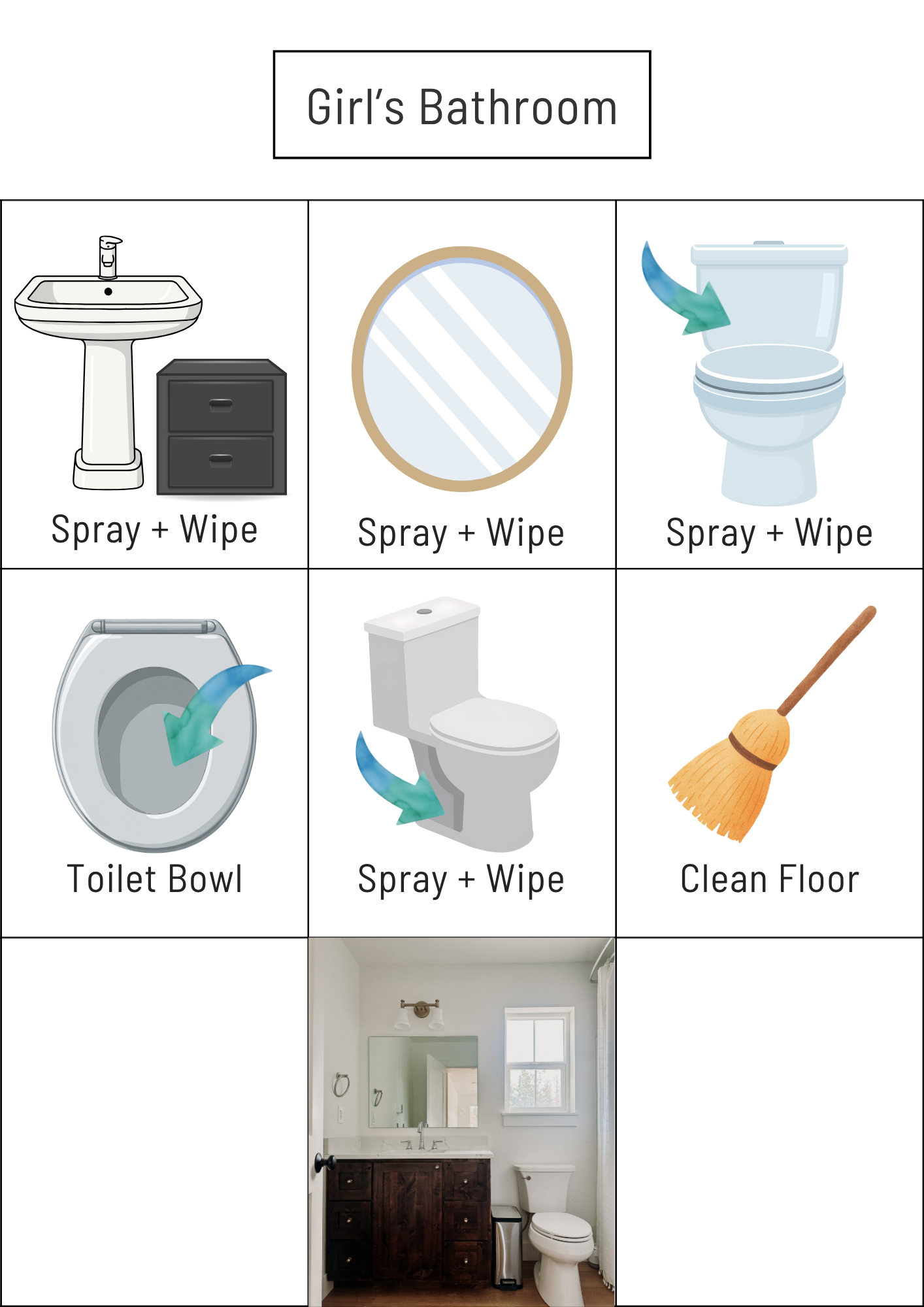 I also made a laminated chart that is taped inside each bathroom cabinet. It has pictures of every task that needs to be done and a picture of what the finished bathroom should look like. This has been a game changer for making sure they actually know what "clean" means. You can grab the editable template I created HERE.